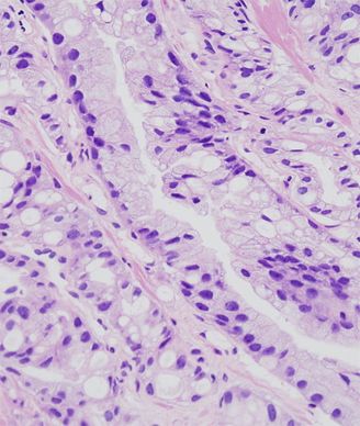 Histopathologic image of prostate obtained by core needle biopsy; source: KGH, Wikimedia Commons