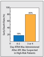 While the cure rates for APL are remarkable, early death (defined as death within 30 days of diagnosis) continues to be a major cause of treatment failure. In clinical trials, the induction death rate ranges between 5% and 9%.[1,4] In population-based studies (including patients who never enrolled in trials), the early death rate ranges between 17% and 30% and is considerably higher in older patients (Table 1).[2,6] Indeed, the early death rate has not changed significantly since the introduction of ATRA. The major cause of early death is hemorrhage, usually pulmonary or intracerebral, caused by the characteristic coagulopathy associated with this disease. What accounts for early death? An abstract presented at the 2011 meeting of the American Society of Hematology suggested that early death may be related to delays in receiving ATRA once patients present to the hospital.[7] The authors hypothesized that early death could be reduced with the rapid administration of ATRA-without waiting for the results of bone marrow aspiration and confirmation of t(15;17). In this retrospective analysis of 194 patients, most patients (69%) had ATRA administered 2 days or more after presentation (Figure 1). While the early death rate was not increased, the percentage of patients who died from hemorrhage was markedly increased when ATRA was delayed for more than 2 days. Results of this retrospective analysis also confirmed that high-risk patients with APL who received their first dose of ATRA 3 or 4 days after they were suspected of having APL had an early death rate of 80%, compared with a rate of only 18% in high-risk patients who received ATRA on days 0, 1, or 2.