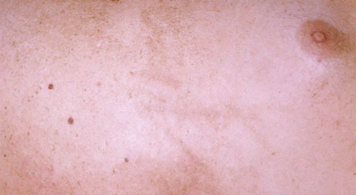 A 26-year-old man was diagnosed with the nodular sclerosing subtype of Hodgkin lymophoma, stage II-A. He was started on cyclic combination chemotherapy consisting of adriamycin, bleomycin, vinblastine, and dacarbazine ("ABVD" therapy). Although generally tolerating the treatment well, about 2 weeks after the second cycle of treatment, he noted and complained about slightly pruritic discoloration of his trunk. His left chest is depicted in the figure.