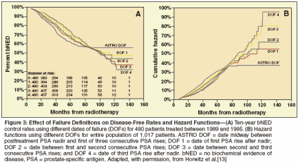 Horwitz and colleagues recentlyillustrated the difference in outcomeresults related to backdating thefailure date to various points in timevs calculating failure from the time itis declared, at the third PSA rise(Figure 3A).[13] This group showedthat distortion of the Kaplan-Meiercurves would be minimized by movingthe failure date closer to the pointat which it is declared (Figure 3B).They felt that this would provide amore realistic assessment of an actuarial-based estimate of outcome.
