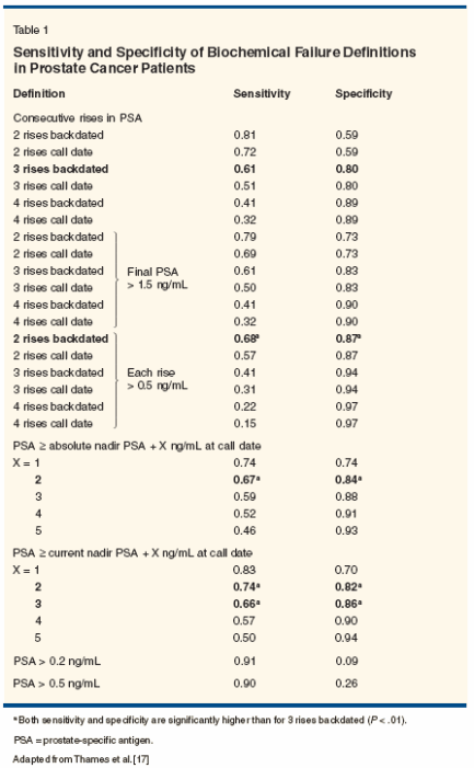The introduction of prostate-specific antigen (PSA) as a reliabletumor marker for prostate cancer brought significant changes in theend points used for outcome reporting after therapy. With regard to adefinition of failure after radiation, a consensus was reached in 1996that took into account the particular issues of an intact prostate aftertherapy. Over the next several years, the consensus definition issued bythe American Society for Therapeutic Radiology and Oncology(ASTRO) was used and studied. Concerns and criticisms were raised.The sensitivity and specificity of this definition vs other proposals hasbeen investigated, and differences in outcome analyzed and compared.Although the ASTRO definition came from analysis of datasets on external-beam radiation and most of the work on this topic has been withthis modality, failure definitions for brachytherapy must be exploredas well. The concept of a universal definition of failure that might beapplied to multiple modalities, including surgery, should also be investigated,at least for comparative study and research purposes.
