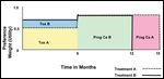 In this example, the utility for Tox A = 0.5, for Tox B = 0.7 and utility Prog Ca A = utility Prog Ca B = 0.8. Treatment A results in 0.85 QALYs [(0.5 x 0.5 years) + (0.8 x 0.75 years)] and Treatment B results in 0.75 QALYs [(0.7 x 0.5 years) + (0.8 x 0.5 years)].