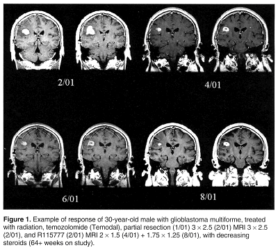 But first, a second phase II trial of R115777 in recurrent glioblastoma multiforme is planned, with patients taking enzyme-inducing anti-epileptic drugs (EIAEDs) for protection against seizures. None of the patients in the previous phase II trial were taking EIAEDs, although the drugs are commonly given to patients with brain tumors.