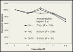 Most studies show a decline in PFTs after thoracic RT (Table 2). Reductions in FEV1 are appreciated approximately 3 to 6 months post-RT, sometimes followed by partial or complete recovery at about 12 months. DLCO is typically reduced to a greater degree than FEV1 and appears to show less recovery at 12 months than FEV1. Most studies show a proportional decline in both FEV1 and FVC, such that the FEV1/FVC ratio remains in the normal range,[26] consistent with a restrictive process. In the few patients systematically studied for long-term changes in PFTs, there appears to be continued diminution in PFTs 2 to 8 years post-RT (Figure 3).[27]