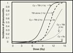 • Single Fraction-With single-fraction whole-lung irradiation, the risk of pneumonitis is dependent on dose-rate and whether chemotherapy is also prescribed. The risk of pneumonitis is decreased with low dose-rate schedules (eg, 5–25 cGy/min, typical of TBI) compared with higher dose-rate schedules (400 cGy/min, typical of hemibody irradiation and whole-lung irradiation).[28] Furthermore, the addition of chemotherapy shifts the dose-response curve to the left (Figure 4). The dose-response curve for whole-lung irradiation is steep, such that a difference of only 1 to 2 Gy increases the risk of pneumonitis substantially. The development of pneumonitis after TBI is an ominous sign, proving fatal in up to 80% of patients.[29]