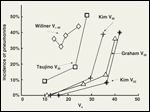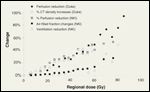 Traditional DVHs assume that all regions of the lung contribute equally to pulmonary function, which is often an erroneous assumption since many patients have heterogeneous regional lung function (eg, from tumor or COPD). Furthermore, metrics such as the V20 or V30 (volume of lung receiving at least 20 or 30 Gy, respectively), consider only a single point on the cumulative DVH. Mean lung dose (MLD) might be a preferable metric because it considers the entire 3D dose distribution. In most series, however, the majority of patients are treated to MLDs in the lower aspect of the range shown. Thus, even though the incidence of pneumonitis is less when the MLD is lower, the absolute number of patients with pneumonitis derived from the low-MLD group is relatively high (Figure 6). In this regard, MLD is not particularly sensitive (ie, it does not predict a high fraction of pneumonitis cases).
