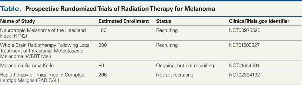 Radiation therapy (RT) was once thought to be ineffective for cutaneous melanoma. Research has demonstrated the value of RT across the disease spectrum, from definitive treatment of melanoma in situ, to adjuvant treatment of resected high-risk disease, to palliative treatment of metastases.[1] In the current issue of ONCOLOGY, Drs. Mahadevan, Patel, and Dagoglu discuss preclinical and clinical data that guide the use of RT to treat melanoma.[2] The authors undertook a challenging task, given the many roles that RT can play in the treatment of melanoma of different origins (skin, uvea, and mucosa) and different stages. Nevertheless, given the advances in melanoma therapy over the last few years, a contemporary review highlighting ongoing clinical trials (Table) is timely.