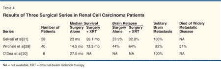 The results of surgical resection of brain metastasis from RCC have been investigated in three retrospective studies.[29-31] Wronski, O’Dea, and Salvati have reported median overall survivals of 14.5 to 27.5 months (Table 4). When comparing the results of surgical series to other treatment modalities for RCC, such as WBRT or stereotactic radiosurgery, one must keep in mind that patients in the surgical series had a much lower burden of disease (80% had only a solitary brain metastasis) and higher performance status than those in the other series. A randomized trial of WBRT vs surgical resection has not been reported, and in the absence of such a report, it is difficult to assess the true impact of surgery vs WBRT. However, given the weight of data from non-RCC randomized trials as well as retrospective RCC studies, current data support the proposition that surgery increases the median survival for patients with good performance status, limited systemic disease, and a single brain metastasis. Furthermore, based on non-RCC data, the benefits of surgery may extend to patients with up to three brain metastases from RCC.[27,28]