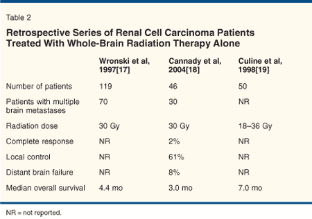 In RCC, however, the effectiveness and role of adjuvant WBRT continue to be controversial. The two RCC surgical series by Wronski et al and Salvati et al have failed to show a benefit with postoperative WBRT (Table 4), both in terms of brain recurrences and overall survival.[29,31] Notably, the radiation doses used by Wronski and Salvati were lower than those in the randomized trial by Patchell. The average dose in Wronski's series was 30 Gy in 10 to 15 fractions, whereas Salvati used various doses and fractions-30 Gy in 10 fractions, 40 Gy in 20 fractions, 45 Gy in 25 fractions, or stereotactic radiosurgery. No significant differences in survival time were noted in the various radiotherapy groups. Whether patients with RCC would benefit from higher-dose WBRT as used by Patchell remains untested and would be of significant interest.