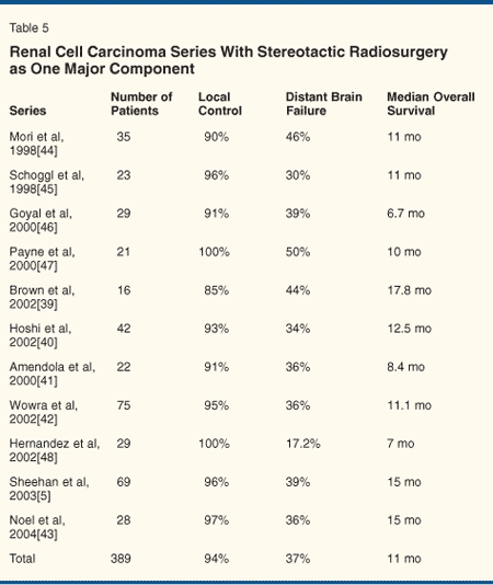 Many retrospective studies have investigated the role of stereotactic radiosurgery in brain metastases from RCC. Table 5 summarizes 11 retrospective RCC series that included stereotactic radiosurgery as one of the main treatment modalities.[5,39-48] When stereotactic radiosurgery is one of the major components of the treatment of brain metastases from RCC, the results are encouraging. The local tumor control rate is 94% (range: 85%-100%), with a distant brain failure rate of 37% (range: 17.2%-50%). The median survival is 11 months (range: 6.7-17.8 months).