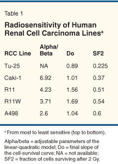 RCC is considered to be radioresistant. Conventional radiation therapy has not been effective in controlling this type of tumor in the curative or adjuvant settings. The lack of effectiveness may well be due to the intrinsic radioresistance of the tumor. In the linear-quadratic model, a low alpha-beta ratio implies radioresistance. Recent experiments with human cell lines of RCC have revealed a low alpha-beta ratio, ranging from 2.6 to 6.92. (Table 1).[8-10] The exact cellular mechanisms of radioresistance in RCC remain elusive, but various intranuclear and extranuclear molecular markers (including p53, BRCA1, BRCA2, HER2/neu, Bcl-2, PI-3k, ataxia telangiectasia kinase, IFG-I, HER1, HER2, VEGF, and ECF) have been shown to influence radiosensitivity for other tumor types.