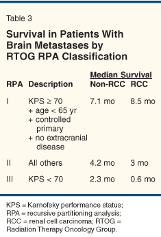 Whole-brain radiation therapy (WBRT) has been the community standard for treating brain metastases from many types of cancers. In general, the median survival time for patients with brain metastases treated with steroids alone is about 2 months. WBRT can increase median survival by 1 to 4 months for most tumor types.[14] The percentage of patients responding to WBRT varies greatly from study to study, with response rates of 50% to 70% generally reported.[15] WBRT alone results in median survivals of 7.1, 4.2, and 2.3 months for Radiation Therapy Oncology Group (RTOG) recursive partitioning analysis (RPA) class I, II, and III, respectively, in patients with brain metastases from nonradioresistant tumors.[16]