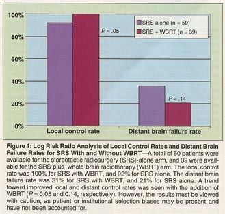 A randomized study by Brown University investigators compared stereotactic radiosurgery vs stereotactic radiosurgery plus WBRT, reporting local control rates of 87% vs 91% and distant brain failure rates of 43% vs 19%.[61] A fundamental problem with the Brown trial was that 53% of the patients had undergone surgery prior to randomization. Furthermore, these patients were not evenly distributed among the three treatment arms.