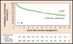 As expected, life-threatening toxicity, primarily neutropenia and decreased left ventricular function, was higher among patients who received 8 cycles of CHOP (40% vs 30%, P = .06). When the study was initially published, the combination of 3 cycles of CHOP plus consolidation RT was associated with improved 5-year progression-free survival (77% vs 64%, P = .03) (Figure 3) and overall survival (82% vs 72%, P = .02). With longer follow-up, 5-year overall survival remained significantly different (82% vs 74%), but mortality related to relapse between years 5 and 10 was increased in the CHOP × 3 plus RT group. These late relapses negated the initial improvement in outcomes.[16] These later results have only been reported in abstract form, necessitating caution in interpreting the “final” results of this study. Nevertheless, the SWOG update suggests that a limited number of chemotherapy cycles may be inadequate to control systemic disease long term in some early-stage patients.