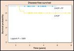 Consolidation RT was well tolerated without major complications. Four patients in the chemotherapy-alone arm experienced failure (3 local failures and 1 distant failure); however, there were no failures after consolidation RT, resulting in a disease-free survival of 100% with RT-compared with 82% in patients without RT (P = .04) (Figure 5). There was no difference in overall survival.