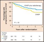 This study evaluated whether the addition of consolidation RT would allow for fewer cycles of chemotherapy. Patients with intermediate- or high-grade non-Hodgkin lymphoma (75% DLBCL) with stage I or non-bulky (smaller than 10 cm) stage II disease were eligible.[15] Patients were randomly assigned to receive either 8 cycles of CHOP or 3 cycles of CHOP plus consolidation RT (40 to 55 Gy, depending on response to chemotherapy). Among the 401 eligible patients, 67% had stage I disease.