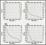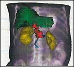 Figure 6 represents a digitally reconstructed (computer-generated) radiograph of a patient with a proximal/mid-duct cholangiocarcinoma treated in the preoperative setting. Figures 7 and 8 demonstrate axial images with varying beam orientations used in treatment. Figure 9 demonstrates a dose-volume histogram (DVH) generated through 3D planning. The DVH displays the volume of tumor and surrounding normal tissues and organs receiving a specified radiation dose level.