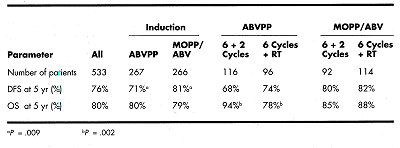 Disease-free survival (DFS) and overall survival (OS) rates were: Cox regression analysis, including the variables of the international prognostic score for advanced Hodgkin’s disease and consolidative treatment, showed a qualitative interaction between induction regimen and consolidative treatment for OS. After ABVPP and radiotherapy, the risk of death was higher than after chemotherapy (relative risk [RR], 4.37; P = .01). After MOPP/ABV, the benefit of radiotherapy was not significant.