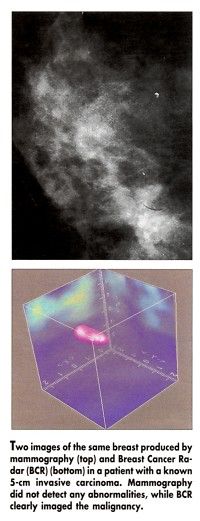 The Breast Cancer Radar (BCR) screening system, which is being developed by Interstitial LLC, Prospect, Illinois, works by detecting differences in water content between malignant and normal breast tissue. Breast tumors contain more water and reflect back the microwave pulses. These signals are analyzed to create a three-dimensional image showing the size and location of the tumor (see Figure).