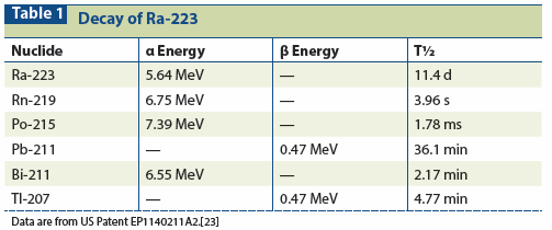 The target of the intravenous bone-targeting radiopharmaceuticals such as Ra-223 and strontium-89 (Sr-89) is hydroxyapatite (Ca5[PO4]3OH), which is an essential and primary component of the inorganic bone matrix. In an osteoblastic metastatic lesion, the cancer cells are mixed in with hydroxyapatite, which is enriched in areas of newly formed bone.[3] Ra, barium (Ba), Sr, and calcium (Ca) are all elemental chemicals in the alkaline earth metal family on the periodic table, and each will localize to areas of osteoblastic metastases. Ra-226, which has a half-life of 1,590 years, is the most common naturally occurring isotope of Ra, however Ra-223 is the most useful for medical therapeutics due to its half-life of only 11.4 days. Although present naturally in small amounts, Ra-223 is manufactured for medicinal purposes by neutron bombardment of Ra-226. Ra-223 decays to a stable isotope of lead (Pb-207) after emitting four alpha particles through the following decay chain: Ra-223 (t½ = 11.4 days) to Rn-219 (radon) (t½ = 3.96 seconds) to Po-215 (t½ = 1.78 milliseconds) to Pb-211 (lead) (t½ = 36.1 minutes) to Bi-211 (bismuth) (t½ = 2.17 minutes) to Tl-207 (thallium) (t½ = 4.77 minutes) to Pb-207 (stable).[4] Table 1 summarizes the details of Ra-223 decay.