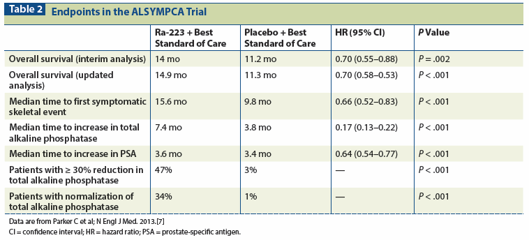Secondary endpoints were met as well. Median time to first SSE was 15.6 months with Ra-223 compared with 9.8 months with placebo (HR = 0.66; 95% CI, 0.52–0.83; P < .001). Time to increase in total alkaline phosphatase level and time to PSA progression were also significantly prolonged in the Ra-223 group. Furthermore, the rates of alkaline phosphatase response and PSA response (defined as ≥ 30% reduction from baseline) were significantly higher in the Ra-223 group. Table 2 summarizes primary and secondary endpoints.