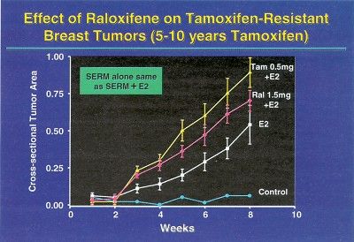 Neither tamoxifen nor raloxifene blocked estrogen-stimulated tumor growth in mouse models. "Tamoxifen and raloxifene are cross-resistant in models of tamoxifen-resistant breast and endometrial cancer. We should not assume that raloxifene will be effective after 5 years of tamoxifen," Dr. O’Regan said.
