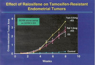 Tamoxifen and raloxifene had similar effects in all the models tested. In tamoxifen-sensitive tumors, neither drug stimulated growth of breast or endometrial cancers. In the short-term tamoxifen-resistant breast cancer model, both raloxifene and tamoxifen stimulated tumor growth. In the long-term tamoxifen-resistant models, both drugs stimulated growth of tamoxifen-exposed endometrial and breast cancers.