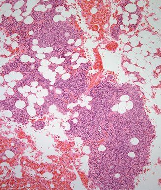 Multiple myeloma showing sheets of tumor cells admixed with adipose tissue
