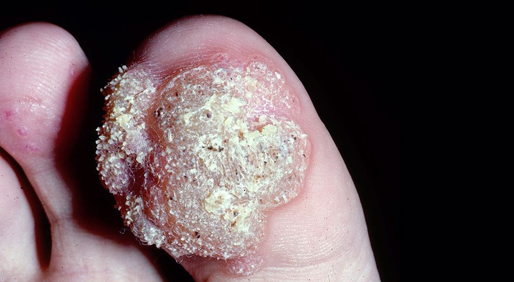 A 20-year-old woman was receiving a multi-agent chemotherapeutic regimen for Hodgkin disease, stage IIB. After the third round of treatment, she presented for medical care because of rapidly growing pedal lesions that made walking painfully difficult.