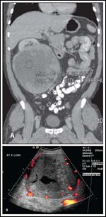 DR. SUBY-LONG: Review of the initial outside CT revealed an 18-cm right renal mass with extensive heterogeneity and no demonstrable macroscopic fat. There were no liver lesions on the initial CT (Figure 3A). An ultrasound obtained within 10 days of the initial CT revealed an 18-cm solid, heterogeneous, moderately vascular mass with central necrosis (Figure 3B).