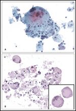 We also reviewed the outside slides of the fine-needle aspiration specimen from one of the lesions in the right lobe of the liver. The cytology smears and histological sections from the cell block showed pleomorphic epithelioid cells very similar to those described in the renal tumor, which were consistent with metastatic EAML (Figure 2A and 2B). Results of immunohistochemical staining performed at the outside institution were reported as positive for HMB-45 and desmin (focal) and negative for pancytokeratin, S100, Melan-A103, and smooth muscle actin (SMA).