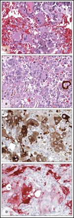 DR. FRANCISCO G. LA ROSA, pathologist: We reviewed the original slides (from an outside institution) of the right kidney nephrectomy specimen. The sections showed a tumor composed of medium- to large-sized polygonal epithelioid cells with eosinophilic cytoplasm, moderately pleomorphic nuclei, prominent nucleoli, and occasional mitotic figures. The tumor showed focal areas of hemorrhage and necrosis and was admixed with clusters of foamy macrophages, some with golden brown pigments consistent with hemosiderin deposits (Figure 1A and 1B). Special stains showed that the tumor cells were positive for Melan-A103 (Figure 1C), HMB-45 (MAA, Figure 1D), and CD68; weakly positive for desmin and CD117; and negative for pancytokeratin, epithelial membrane antigen (EMA), S100 antigen, carbonic anhydrase IX (CA-9), and alpha-methylacyl-CoA racemase (AMACR). Nonspecific staining was present with CK7, 34BE12, and CD10.