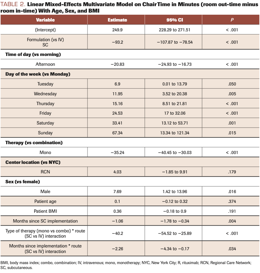 A linear mixed-effects multivariable model with random intercept was used to analyze the association between treatment type and chair time in the year prior to, and the year following, R-SC adoption at MSKCC. Random intercept accounted for repeated measures within patients. Model covariates were sex, age, body mass index (BMI), treatment time (morning vs afternoon; effect of day of week), clinic location (regional vs local), months since SC implementation, and therapy type (monotherapy vs combination). Sex, age, BMI, therapy type, and months since SC implementation were determined a priori, and remaining covariates were selected if they were significant in the association between treatment type and chair time.