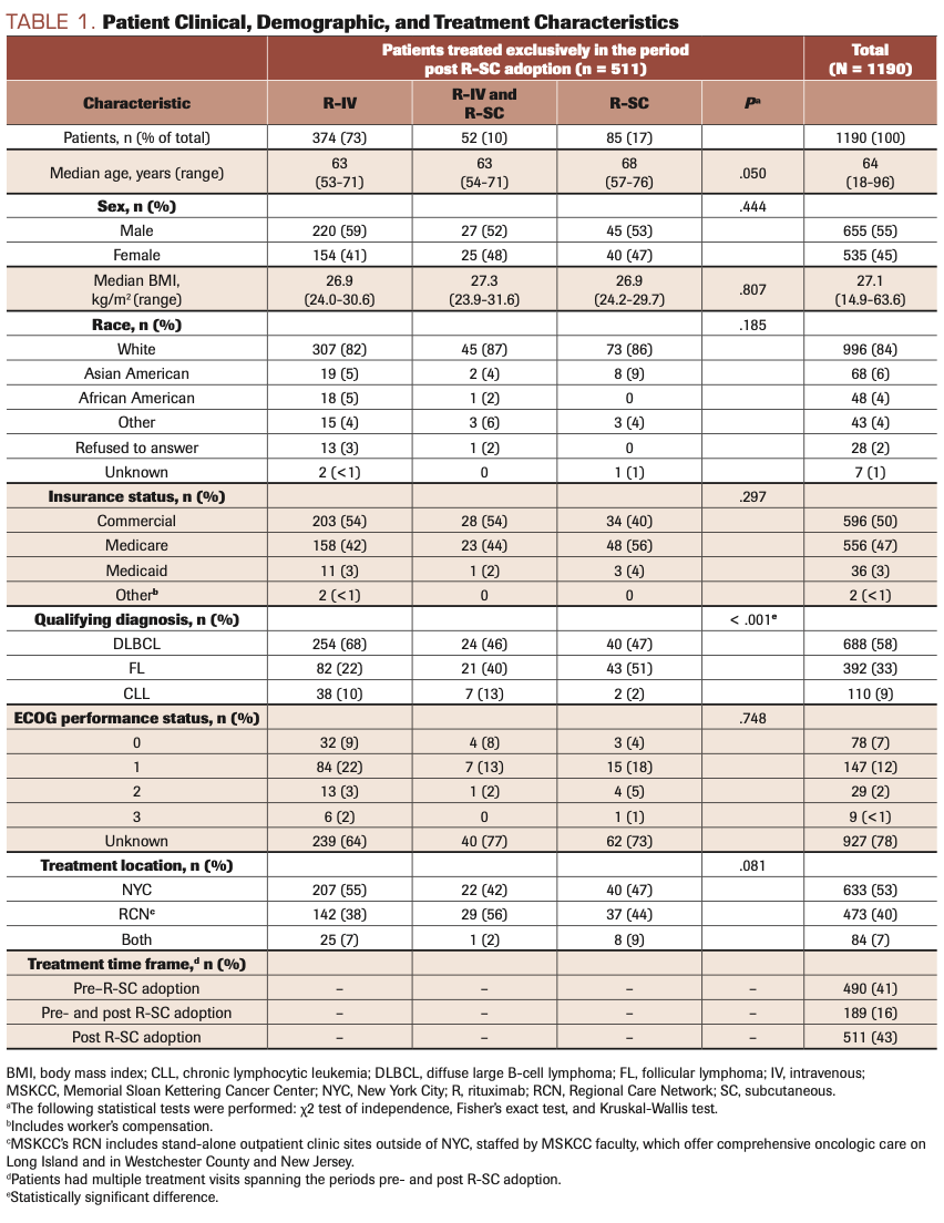 This was a single-center, retrospective, observational analysis. Patients were identified based on diagnosis and delivery of a rituximab-containing regimen; data were extracted for the period of September 2016 through September 2018 (R-SC was added to the hospital formulary at MSKCC in September 2017).
