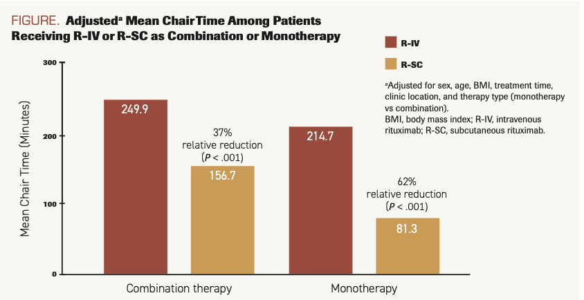 Rituximab-subcutaneously is associated with significantly reduced chair time vs rituximab-intravenously in a US oncology setting. Widespread adoption would be expected to improve practice efficiency and patient access to care, and to reduce health care resource burden.