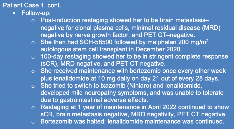 During the COVID-19 pandemic, [instead of] relying strictly on the evidence, [we were] doing what we could and learning lessons from our experience. This patient didn’t have an interim biopsy. Other than her diagnostic biopsy, her first biopsy was for MRD negativity once she attained the CR. But yes, I’ll offer it to her next year, if she’s still with me.