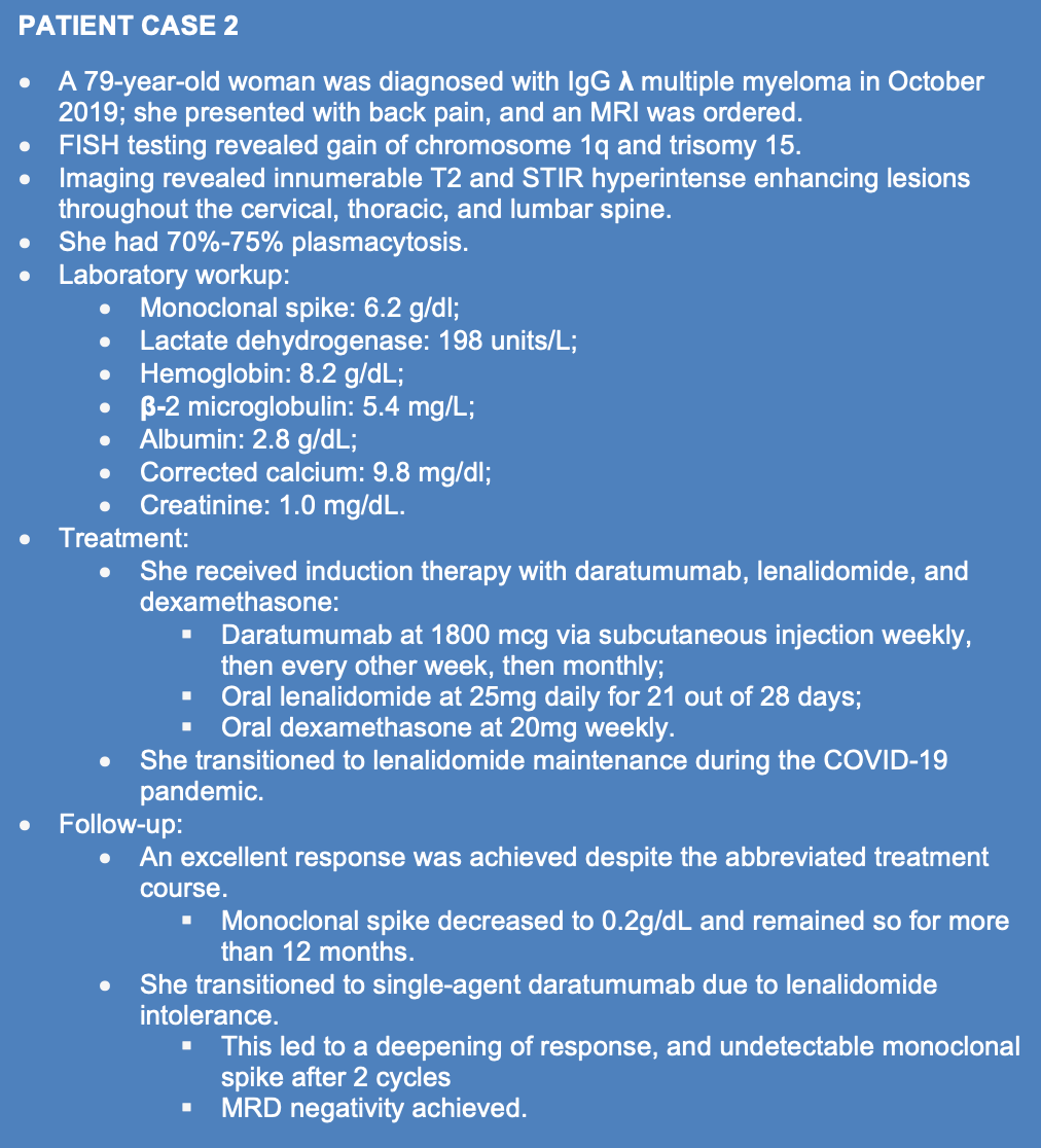 Rossi: MAIA is the basis for this patient’s treatment. MAIA examined what was considered a standard of care—lenalidomide and dexamethasone—with or without upfront daratumumab in transplant-ineligible patients. Unsurprisingly, the triplet performed better than the doublet, not only in terms of overall response but also in terms of MRD negativity.