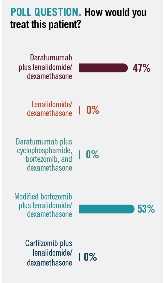 Audience members who participated in the presentations voted on which treatment regimen they would use to treat this patient, and all participants chose to give either daratumumab plus Rd or modified bortezomib plus Rd (Poll question).