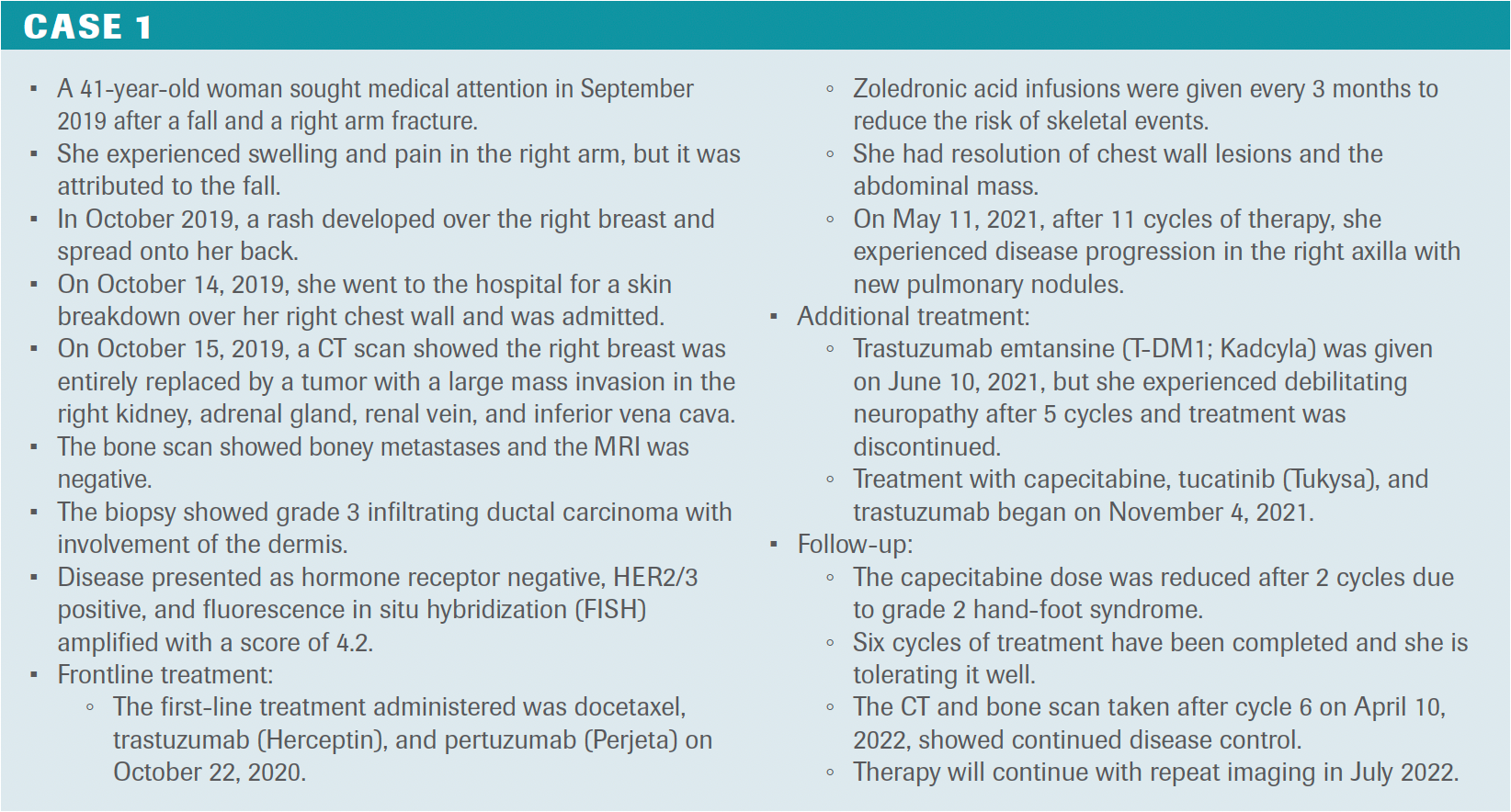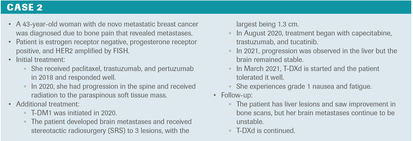 Nanda: I have seen patients like this. Most of our patients [present with] de novo metastatic disease now, so this is consistent with what I’ve seen. We know from the HER2CLIMB trial that patients with brain metastases have had regression of their brain metastases on tucatinib-based therapy. I had 2 patients who participated on that trial who went in with small brain metastases that regressed on therapy. I subsequently found that out after the fact when treatment was unblinded and [I learned that] they were [in the] tucatinib [arm]. Now, if I saw a patient like this, I might not do stereotactic radiosurgery; [I might] just treat with the HER2CLIMB regimen, see how it goes, and radiate if needed.