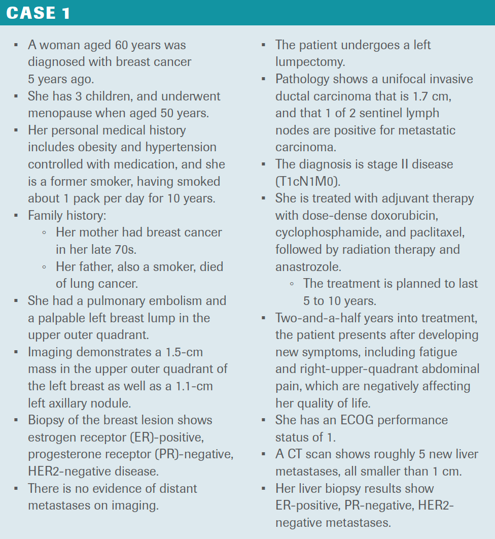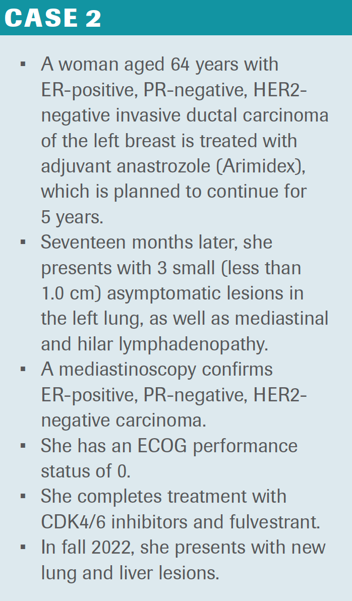 IYENGAR: This is a patient for whom I’d consider using fulvestrant, particularly given her previous relapse on an aromatase inhibitor. I would also consider clinical trial availability, especially any ongoing trials combining oral selective ER degraders with CDK4/6 inhibition. Otherwise, this is a patient I would treat with fulvestrant plus ribociclib.