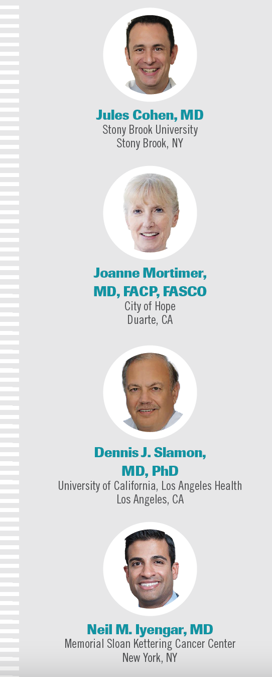 The panelists were Joanne Mortimer, MD, FACP, FASCO, the Baum Family Professor in Women’s Cancers and vice chair of the Department of Medical Oncology & Therapeutic Research at the City of Hope National Medical Center in Duarte, California; Dennis J. Slamon, MD, PhD, director of clinical/translational research, director of the Revlon/UCLA Women’s Cancer Research Program at Jonsson Comprehensive Cancer Center, and executive vice chair for research of the Department of Medicine at the University of California, Los Angeles; and Neil M. Iyengar, MD, associate attending physician at the Memorial Sloan Kettering Cancer Center and professor of medicine at Weill Cornell Medicine in New York, New York.