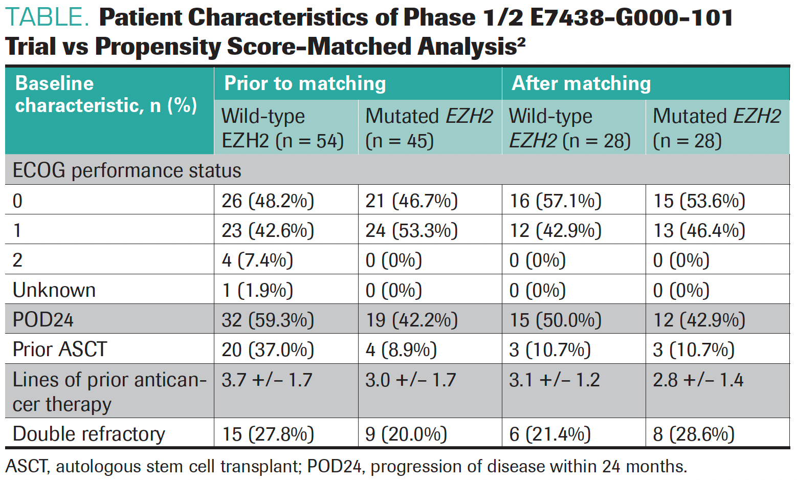 In the current analysis, propensity matching produced 28 sets of patients with either EZH2 mutations or wild-type disease. The patient characteristics prior to and after matching can be seen in the Table.2