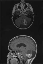 • Medulloblastoma-Medulloblastoma is the most common malignant brain tumor in children. About 400 children are diagnosed with this tumor each year in the United States.[1] The peak age of onset is between 5 and 9 years. Over 90% of medulloblastomas typically arise from the superior medullary velum, growing to fill the cavity of the fourth ventricle (Figure 4).[33] The tumor mass can encroach on to the cisterna magna and sometimes infiltrates the floor of the fourth ventricle or brain stem. A minority of tumors, particularly in patients over 16 years of age, arise more laterally in the cerebellar hemispheres.[33] Macroscopically, these tumors are soft, friable, and moderately demarcated from the cerebellar tissue. Areas of central necrosis may be present.