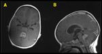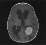 Choroid plexus tumors are rare in children, comprising 2% to 4% of brain tumors in this population.[81] Choroid plexus tumors can either be a choroid plexus papilloma (60%-80%) or carcinoma (20%-40%).[81] The predominant location of these tumors is in the lateral ventricles and, less commonly, the IV and III ventricles. Choroid plexus tumors that occur in the lateral ventricles are invariably diagnosed in infants or young children at a median age of 24 months.[81] These tumors typically arise from the choroid plexus epithelium and are extremely vascular.