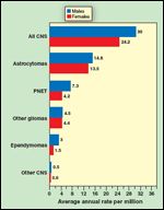 Each year in the United States, an estimated 11,000 children between the ages of 0 and 15 years are diagnosed with cancer, of which 2,200 suffer from invasive central nervous system (CNS) tumors.[ 1,2] Brain tumors are second only in frequency to acute lymphoblastic leukemia in children. The incidence of CNS tumors in children under age 20 years in this country is 3 to 4 cases per 100,000/year. Just over half of all pediatric brain tumors (52%) are low-grade cerebellar astrocytomas, followed by primitive neuroectodermal tumors (PNETs), other gliomas (21%), and ependymomas (9%), as illustrated in Figure 1.[1] The incidence of low-grade astrocytomas, PNETs, and ependymomas is inversely proportional to age, whereas that of malignant glioma is relatively constant between birth and age 20 years.[2] The incidence of CNS tumors in children has been increasing in recent years, which is partlyattributed to the advent of better imaging technology including magnetic resonance imaging (MRI).[3]
