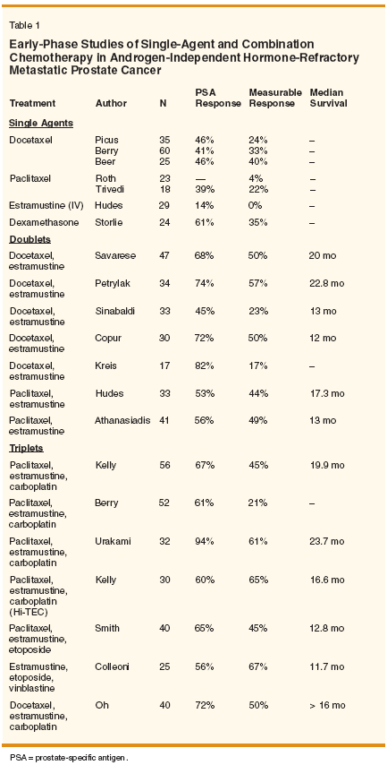 Androgen-deprivation therapy, usually with combined androgen blockade, is standard initial treatment for advanced prostate cancer. With failure of initial treatment, as indicated by rising prostate-specific antigen (PSA) levels, second-line hormonal therapy is usually instituted. Over the past several years, it has become increasingly clear that systemic chemotherapy has an important role in hormone-refractory disease. Phase II trials have demonstrated high PSA and measurable disease response rates with taxane single-agent and combination treatments. One recent phase III trial showed that docetaxel (Taxotere)/ estramustine (Emcyt) significantly improved overall survival, progression- free survival, and PSA response rate compared with mitoxantrone (Novantrone) plus prednisone. Another phase III trial demonstrated that docetaxel given every 3 weeks plus prednisone significantly improved overall survival, PSA response rate, pain relief response rate, and quality of life compared with mitoxantrone and prednisone. On the basis of these findings, every-3-week docetaxel plus prednisone is now considered standard first-line therapy for metastatic hormonerefractory disease. There is considerable optimism that treatment can be further improved. Studies of taxane combinations with bevacizumab (Avastin), thalidomide (Thalomid), bortezomib (Velcade), antisense Bcl-2 oligonucleotide, mTOR inhibitors, epidermal growth factor receptor inhibitors, and KDR inhibitors are under way. Randomized phase III trials in progress or planned are examining docetaxel in combination with imatinib mesylate (Gleevec) or calcitriol and docetaxel/prednisone in combination with bevacizumab and an antisense clusterin compound. Other promising systemic agents include epothilones and atrasentan, and promising vaccines include Provenge, GVAX, and Prostvac.