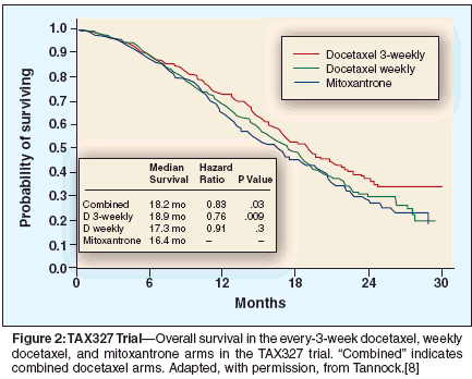 8. Tannock IF, de Wit R, Berry WR, et al: Docetaxel plus prednisone or mitoxantrone plus prednisone for advanced prostate cancer. N Engl J Med 351:1502-1512, 2004.