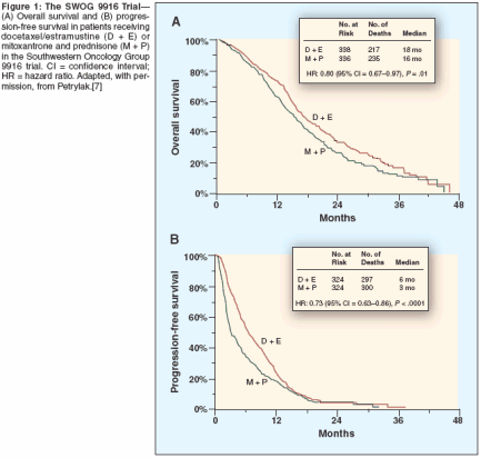 In the early 1990s, agents such as vinblastine and doxorubicin were evaluated in hormone-refractory disease and showed some activity. However, it was with the introduction of the taxanes in the mid-1990s that the real potential for chemotherapy in hormone-refractory metastatic disease was recognized. In phase II studies, single-agent taxane treatment resulted in PSA response rates of 40% or greater and taxane/estramustine (Emcyt) combinations produced response rates of 45% to 82% with higher measurable response rates than those observed with single-agent treatment (Table 1)[6]; similarly, taxane triplets have produced high PSA and measurable response rates in phase II trials. These findings led to two large prospective randomized phase III trials of taxane-based therapy, results of which were recently reported. In the Southwestern Oncology Group (SWOG) 9916 trial,[7] 674 patients with advanced hormone-refractory disease were randomized to receive docetaxel at 60 mg/m2 on day 2 and estramustine at 280 mg tid on days 1 to 5 every 3 weeks, or prednisone at 5 mg bid daily plus mitoxantrone at 12 mg/m2 on day 1 every 3 weeks. The docetaxel/estramustine arm exhibited a significant 20% increase (95% confidence interval [CI] = 3%-33%, P < .01) in overall survival and a significant 27% increase (95% CI = 14%-37%, P < .0001) in progressionfree survival (Figure 1); docetaxel/ estramustine treatment was also associated with a significant improvement in PSA response rate (50% vs 27%, P < .0001) and a nonsignificantly better objective response rate (17% vs 11%, P = .15). Higher rates of toxicity were seen with docetaxel/estramustine; however, there was no difference in toxic death rates or rates of study discontinuation between treatments. In the TAX327 trial,[8] 1,006 pa-tients with hormone-refractory disease were randomized to either (1) docetaxel (Taxotere) at 75 mg/m2 every 3 weeks plus prednisone at 10 mg/d, (2) docetaxel at 30 mg/m2 weekly plus prednisone at 10 mg/d, or (3) mitoxantrone at 12 mg/m2 every 3 weeks plus prednisone at 10 mg/d. The pooled docetaxel arms exhibited a significant 17% improvement in overall survival (hazard ratio 0.83, P = .03) (Figure 2). The improvement in overall survival was significant for the every-3-week docetaxel regimen (24% reduction in risk of death; hazard ratio 0.76, 95% CI = 0.62-0.94, P = .009), but not for the weekly docetaxel regimen. Compared with the mitoxantrone regimen, the every-3- week docetaxel regimen was also associated with a significantly improved PSA response rate (45% vs 32%, P < .0005), a significantly improved pain response rate (35% vs 22%, P = .01), and significant improvements in quality-of-life measures. These studies led to the recent approval of docetaxel administered every 3 weeks plus prednisone for treatment of metastatic prostate cancer. Among the issues left open by these findings are the role of weekly docetaxel treatment and the potential role of estramustine in taxane combinations. With regard to the latter, although phase II trials indicated that the addition of estramustine to docetaxel improved response rates, and although the combination was superior to mitoxantrone/ prednisone in the SWOG 9916 trial, the median overall survival in the combination arm in the SWOG trial (18 months) was similar to the survival with docetaxel alone in the TAX327 study (18.9 months with the every-3-week regimen). In the absence of a direct comparison of docetaxel/estramustine vs docetaxel alone it thus remains unclear whether the use of estramustine confers any survival benefit. Indirect evidence of a potential benefit comes from earlier combination studies. For example, a randomized trial comparing estramustine at 600 mg/m2 plus vinblastine at 4 mg/m2 weekly vs vinblastine alone in 201 patients with hormone-refractory disease[9] showed a significant improvement in progression- free survival (median 3.71 vs 2.20 months, P < .0004) and a trend toward improvement in the primary end point of overall survival (median 11.9 vs 9.2 months, P = .08) in the estramustine arm. Rather than representing a momentous advance in the treatment of hormone- refractory disease, the trials of docetaxel therapy really provide proof of principle that chemotherapy can prolong survival and open the way for evaluation of combination treatment involving a number of interesting compounds. For now, docetaxel on an every-3-week schedule plus prednisone is considered the standard first-line therapy for metastatic hormone- refractory disease. The role of estramustine in treatment is uncertain, but most practitioners are not using this agent. The efficacy of second-line agents such as mitoxantrone remains undefined. Phase II trials of combinations of docetaxel with a variety of agents have been completed, are under way, or are planned, including combinations with bevacizumab (Avastin), thalidomide (Thalomid), bortezomib (Velcade), antisense Bcl-2 oligonucleotide, mTOR inhibitors, epidermal growth factor receptor inhibitors, KDR (vascular endothelial growth factor receptor-2) inhibitors, and calcitriol. Randomized phase III trials in progress or planned include studies of docetaxel with/without imatinib mesylate (Gleevec) at several centers (M. D. Anderson Cancer Center, Dana-Farber Cancer Institute, Memorial Sloan-Kettering Cancer Center, University of California-San Francisco, and University of Michigan), docetaxel and prednisone with/without bevacizumab (CALGB trial), docetaxel and prednisone with/without an antisense clusterin (proapoptotic) compound, and docetaxel with/without calcitriol, as well as a study of prednisone with/without satraplatin. Other Promising Systemic Agents Other promising systemic agents include epothilones, which are being examined in early phase studies by a number of groups. In one multicenter randomized phase II trial,[10] 92 patients received epothilone B (BMS- 247550) at 35 mg/m2 IV on day 2, estramustine at 280 mg tid on days 1 to 5, and warf