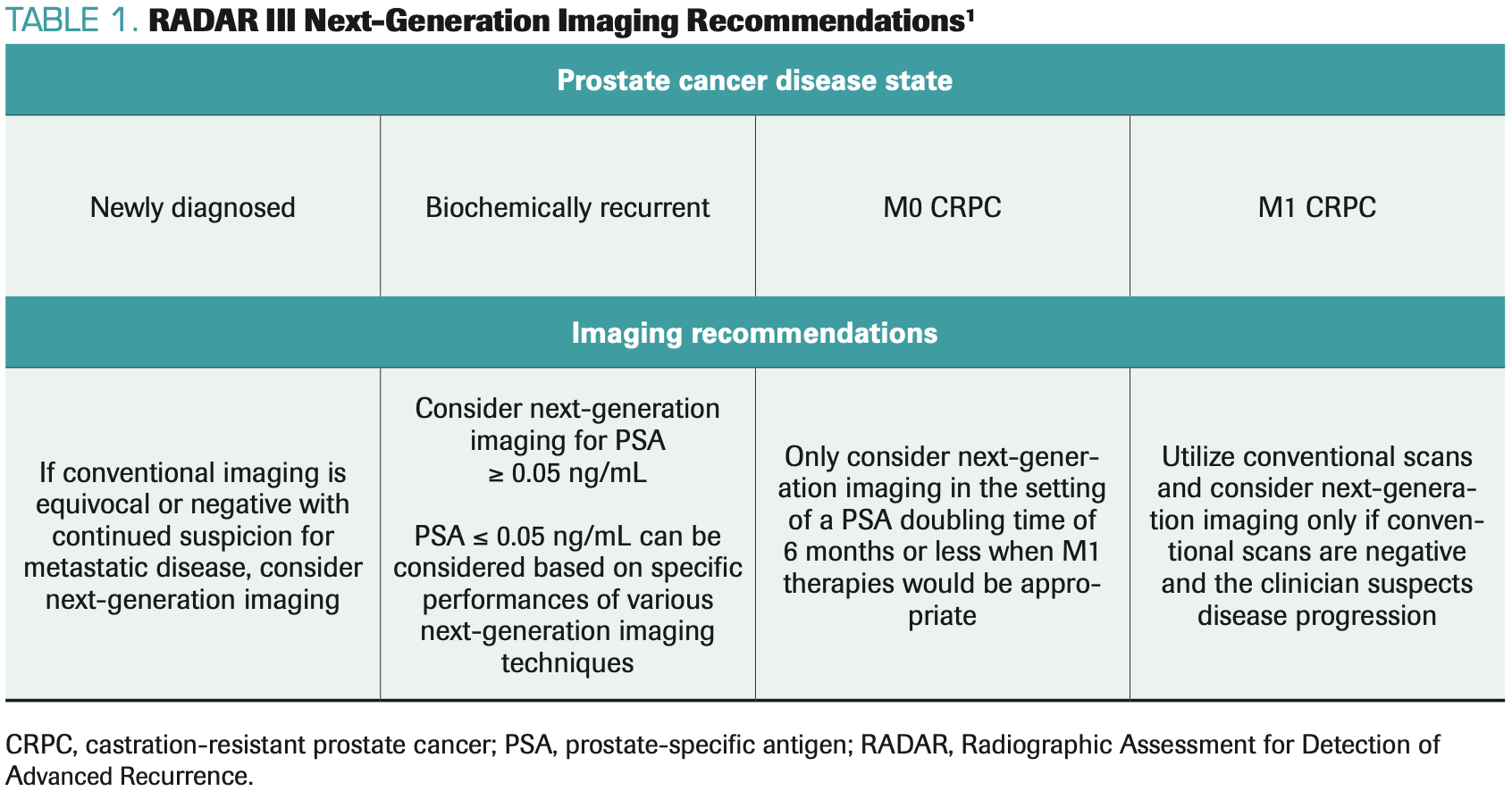 For imaging in a patient with a significant PSA rise, Berger said he references the RADAR III guidelines, which recommend next-generation imaging techniques for detecting previously metastases (Table 1).