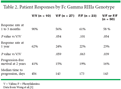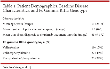 Patient demographics and baselinecharacteristics are detailed inTable 1.[1] Dr. Levy reported that ananalysis of 60 patients revealed that Fcgamma RIIIa position 158 genotypedid not influence rituximab responserate 1 to 3 months after treatment inpatients with previously treated follicularlymphoma (see Table 2).[1]